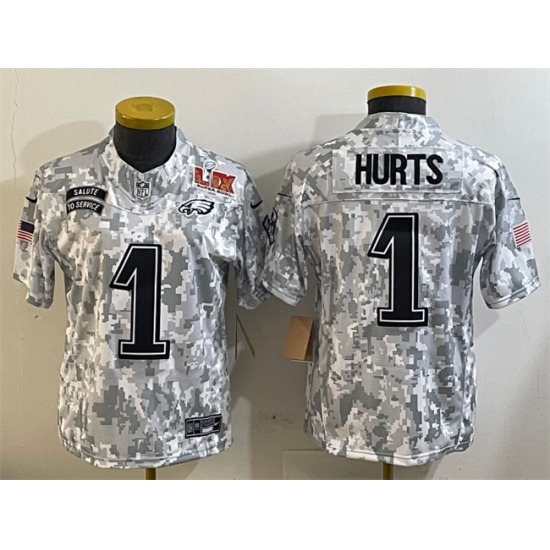 >Women's Philadelphia Eagles #1 Jalen Hurts 2025 Super Bowl LIX F.U.S.E. Arctic Camo Salute to Service Limited Football Stitched Jersey(Run Small)