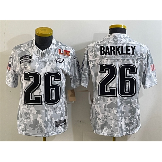 >Women's Philadelphia Eagles #26 Saquon Barkley 2025 Super Bowl LIX F.U.S.E. Arctic Camo Salute to Service Limited Football Stitched Jersey(Run Small)