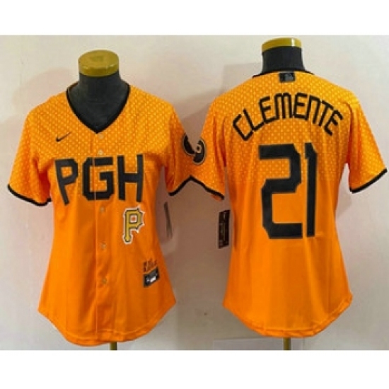 Women's Pittsburgh Pirates #21 Roberto Clemente Yellow 2023 City Connect Stitched Jersey1