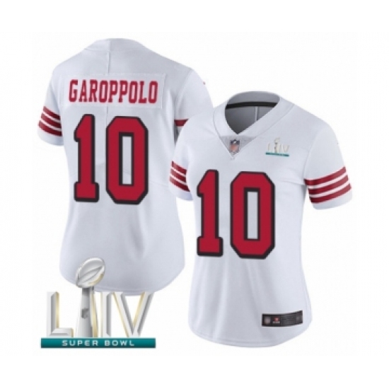 >Women's San Francisco 49ers #10 Jimmy Garoppolo Limited White Rush Vapor Untouchable Super Bowl LIV Bound Football Jersey