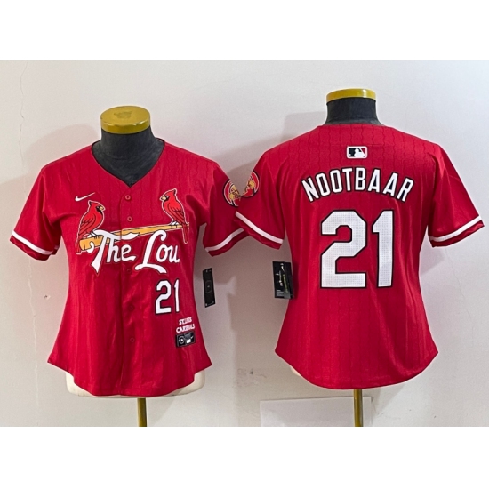 >Women's St Louis Cardinals #21 Lars Nootbaar Red 2024 City Connect Limited Stitched Baseball Jersey