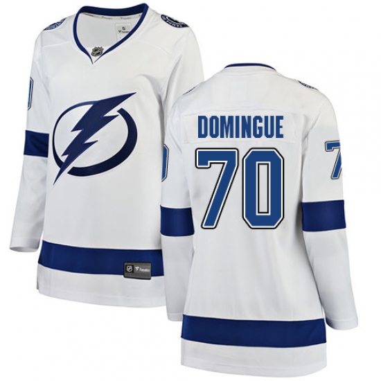 >Women's Tampa Bay Lightning #70 Louis Domingue Fanatics Branded White Away Breakaway NHL Jersey