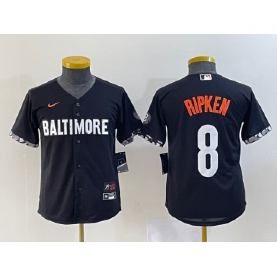 >Youth Baltimore Orioles #8 Cal Ripken Jr Black 2023 City Connect Cool Base Stitched Jersey 1