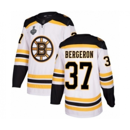 >Youth Boston Bruins #37 Patrice Bergeron Authentic White Away 2019 Stanley Cup Final Bound Hockey Jersey