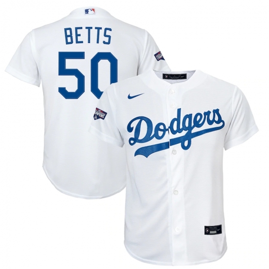 >Youth Los Angeles Dodgers #50 Mookie Betts Nike White 2020 World Series Champions Home Replica Player Jersey