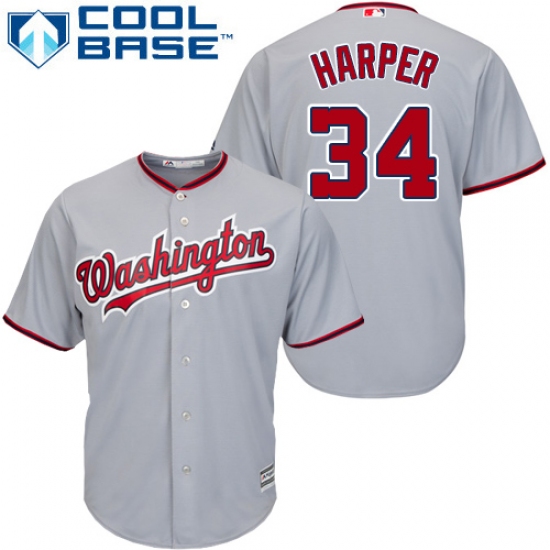 Home>MLB>Washington Nationals>Bryce Harper>Youth Majestic Washington Nationals #34 Bryce Harper Replica Grey Road Cool Base MLB Jersey