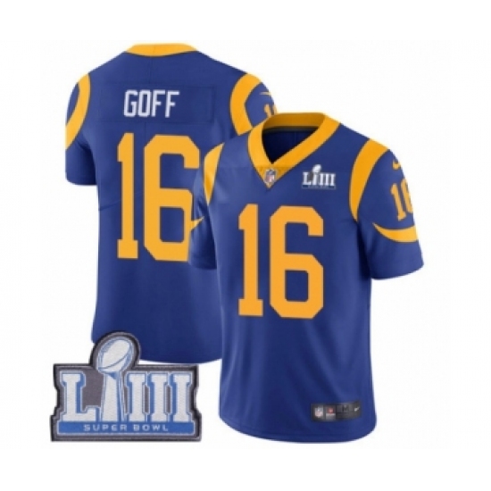 >Youth Nike Los Angeles Rams #16 Jared Goff Royal Blue Alternate Vapor Untouchable Limited Player Super Bowl LIII Bound NFL Jersey