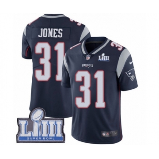 >Youth Nike New England Patriots #31 Jonathan Jones Navy Blue Team Color Vapor Untouchable Limited Player Super Bowl LIII Bound NFL Jersey
