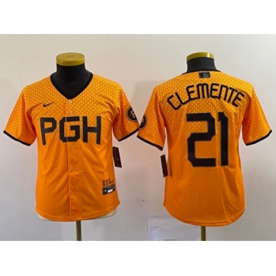 Youth Nike Pittsburgh Pirates #21 Roberto Clemente Yellow 2023 City Connect Stitched Jersey