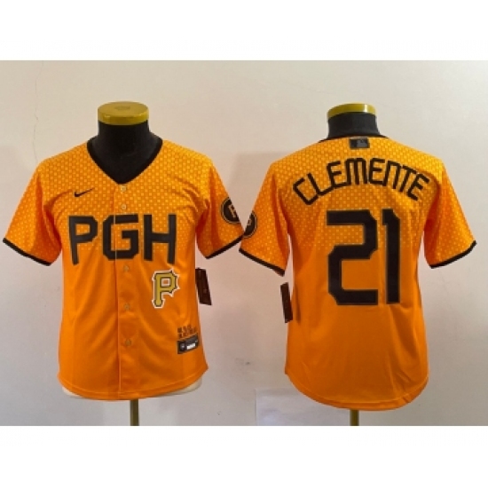 Youth Nike Pittsburgh Pirates #21 Roberto Clemente Yellow 2023 City Connect Stitched Jersey1