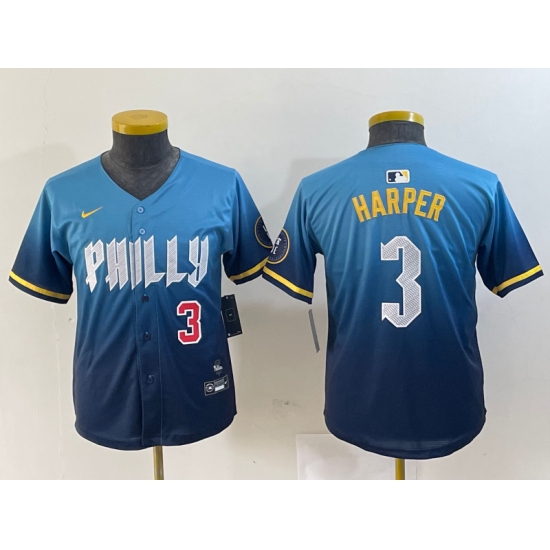 >Youth Philadelphia Phillies #3 Bryce Harper Number Blue 2024 City Connect Limited Stitched Jersey