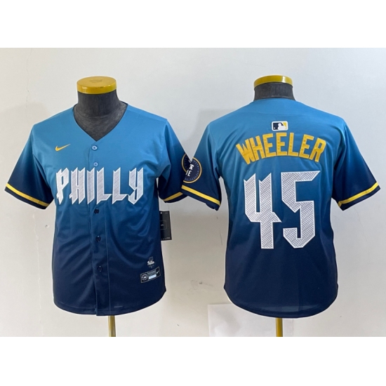 >Youth Philadelphia Phillies #45 Zack Wheeler Blue 2024 City Cool Base Stitched Jersey
