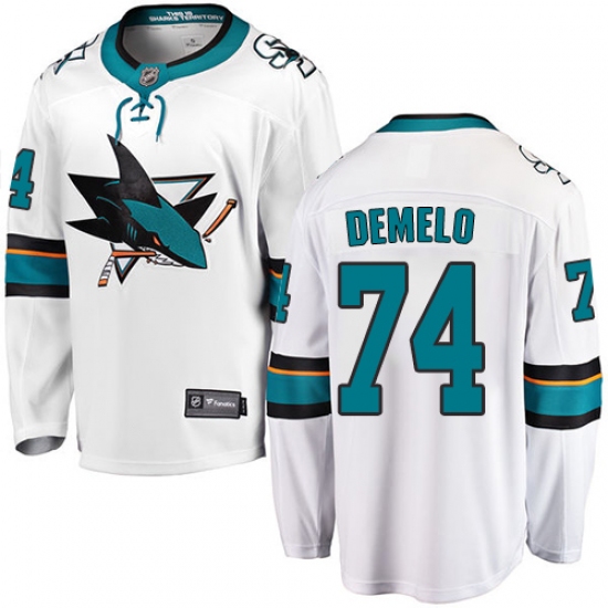 Home>NHL>San Jose Sharks>Dylan DeMelo>Youth San Jose Sharks #74 Dylan DeMelo Fanatics Branded White Away Breakaway NHL Jersey