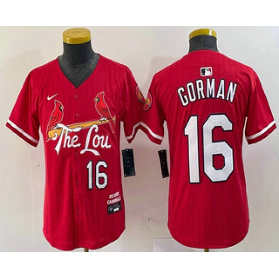 >Youth St Louis Cardinals #16 Nolan Gorman Red 2024 City Connect Stitched Baseball Jersey